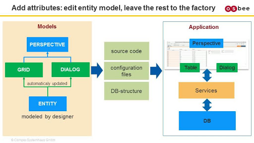 OSBP creates platform-independent applications that run in all prevalent environments, feed from most data sources and deliver to practically all devices. The factory persists the model of the app in domain-specific languages (DSL), not source code. This allows designers and, of course, software developers to make changes easily at any time. Human-made modifications in one programming layer are adjusted by OSBP's robot hand in all other related layers. Developers could even replace any underlying framework with a more suitable one without losing the know-how and structure of the app.