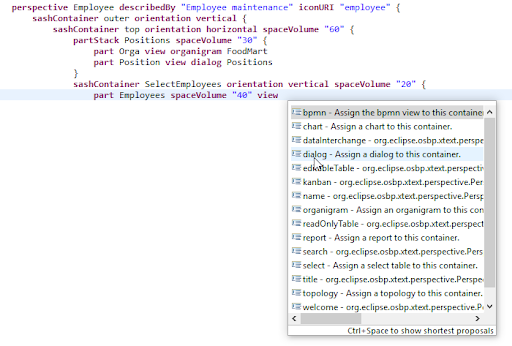 The factory has defined DSLs for all domains that a typical business app is made of, 26 in total. Examples are the user interface, authorization, reports, database models, data import, etc. The modeling is facilitated by Content Assist, a functionality of the Eclipse IDE that has been integrated to support the work with OSBP. Click CTRL+SPACE, then a drop-down list appears showing context-dependent input choices. Not only does this speed up the modeling, but it also makes it extremely easy to familiarize yourself with the "factory slang".