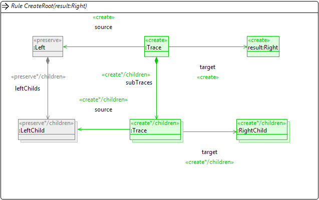 In my Henshin diagram, I can design the transformation of "Left" to "Right" (using Trace model), which works fine.