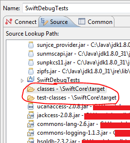 In the problematic scenario described, I see the "classes" and "test-classes" output folders added to the source lookup of the Remote Debug conifguration.