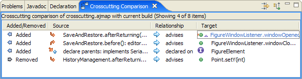 Once you have one or more crosscutting map files in your project, you can perform a comparison. Two such files can be compared with each other, or you can compare the relationships in one file against the relationships present in the current build. These two comparison options are available by selecting one or two map files in the package explorer, then right-clicking and selecting the appropriate option from the context menu. The results of the comparison are then displayed in a new view, as shown in Figure 7: