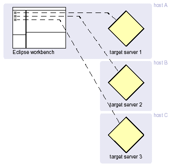 From the point of view of an administrative application, the world is composed of the target systems being administered together with the environment of the application itself. The figure below shows the target servers running either on a different host or on the same machine with the Eclipse workbench, though in a different JVM.