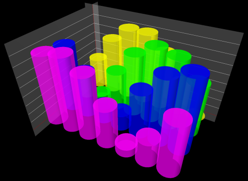 The end result is shown in Figure 6. The view point can be moved around and rotated using either the mouse left or right buttons or the keyboard. Depending on the angle from which the chart is inspected, one can observe different interaction of the light source and objects in the scene. The color blending creates the translucent appearance of cylinders.