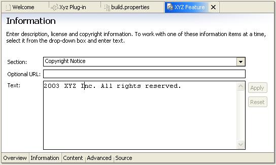 The wizard operation is analogous to the one for plug-in projects in that it creates the project and the necessary files, and opens the feature manifest for editing. The manifest editor is the usual PDE variety which means that you don't need to know the exact XML DTD to be productive - you can use form pages exclusively.