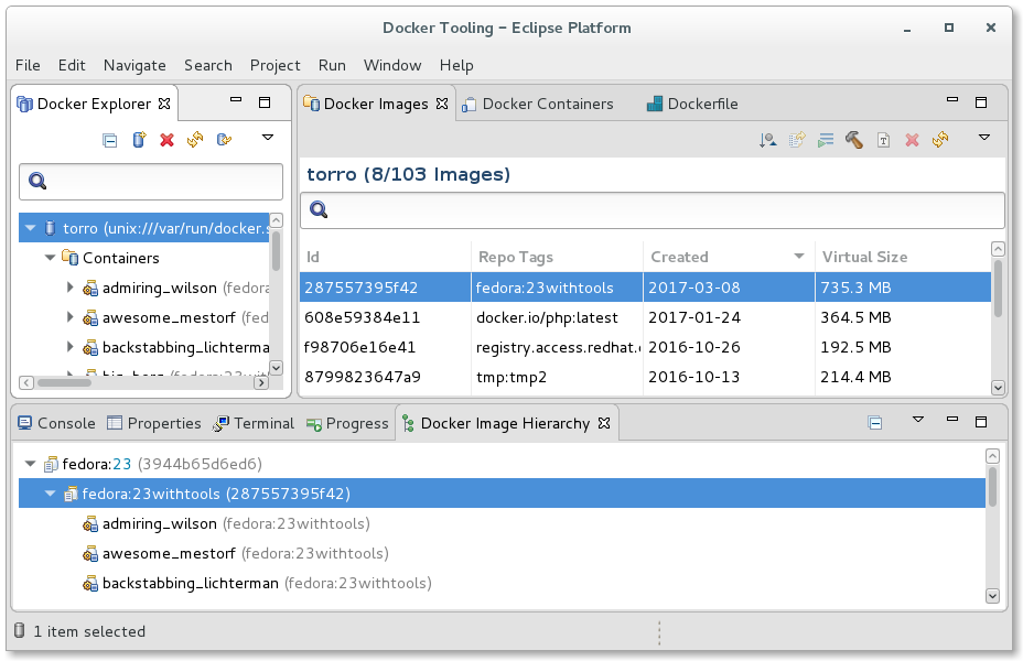 With the Eclipse Mars release, the Linux Tools project contributed the Docker Tooling plug-ins. This set of plug-ins provides access to docker command tasks with an Eclipse UI, making it easier to use. The Docker Tooling perspective includes an Explorer View which shows a tree view of Docker daemon connections, an Images View which shows a table of images that have been pulled by a connection, and a Containers View which shows containers that have been created by the active connection.