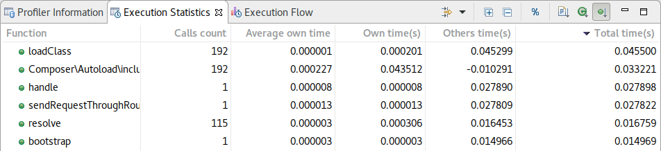 The “Execution Statistics” view displays the list of files that were called during the profiling process and detailed information on processing times for elements within the files. The window contains statistics relevant to each element as follows: