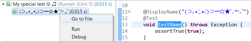 JUnit Jupiter’s @DisplayName annotation allows you to provide custom display names for test classes and test methods which can have spaces, special characters, and even emojis. In Eclipse, you can see the custom test names in JUnit view. You can use the Go to File action or you can just double-click on the custom test name to navigate to the corresponding test from JUnit view: