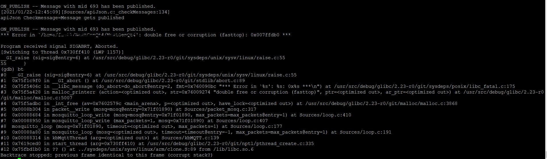 I am using Mosquitto source code lib to create a MQTT client talking to test.mosquitto.org. The code will randomly stop after runs for several hours due to the "double free" error.