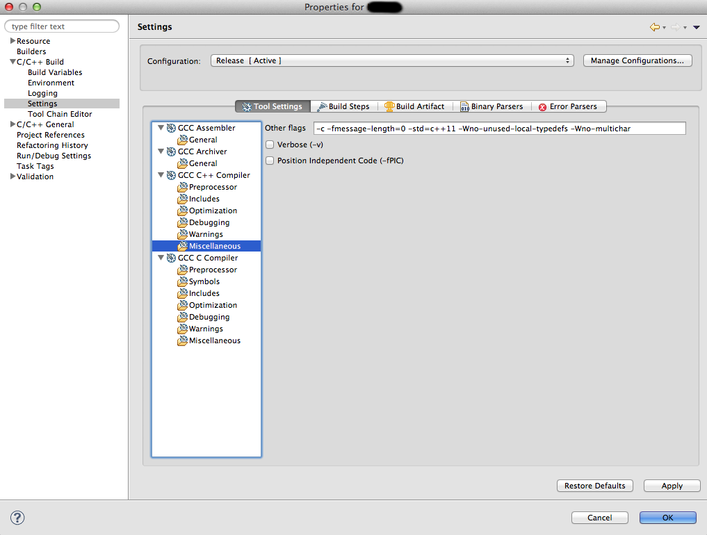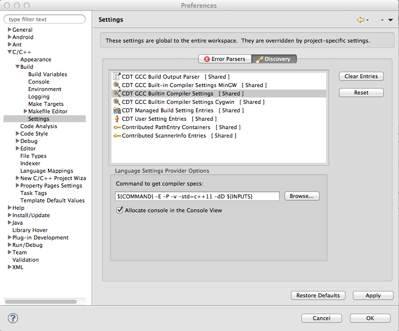 - Of course I also have to add "-std=c++11" in obscure places. Who in his right mind would get the idea to look under the hidden 'Discovery' tab to add this to the built-in compiler options? The fact that this is mentioned in the FAQ doesn't make it any better.