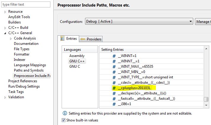Anyway, it is possible to have the indexer see 201103L if the "CDT GCC Built-in" provider comes before CDT Managed. No need to define a user symbol.