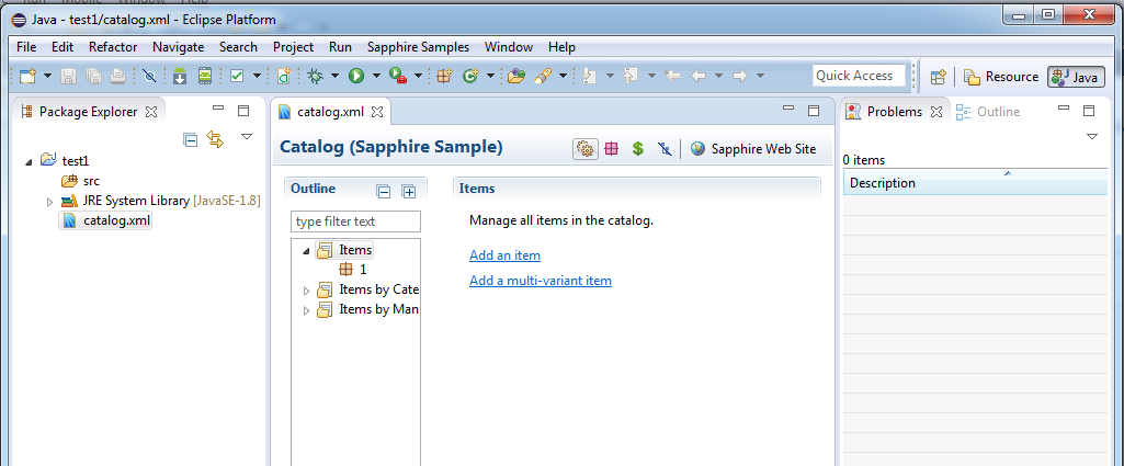 Reproduced it on "clean" Sapphire & workspace - checked out Sapphire source from the Git repo, Launched it with Luna as a target platform, created Java project & catalog.xml file into it, opened this file with Sapphire editor from Samples project, added some content (please see the linked screenshot)