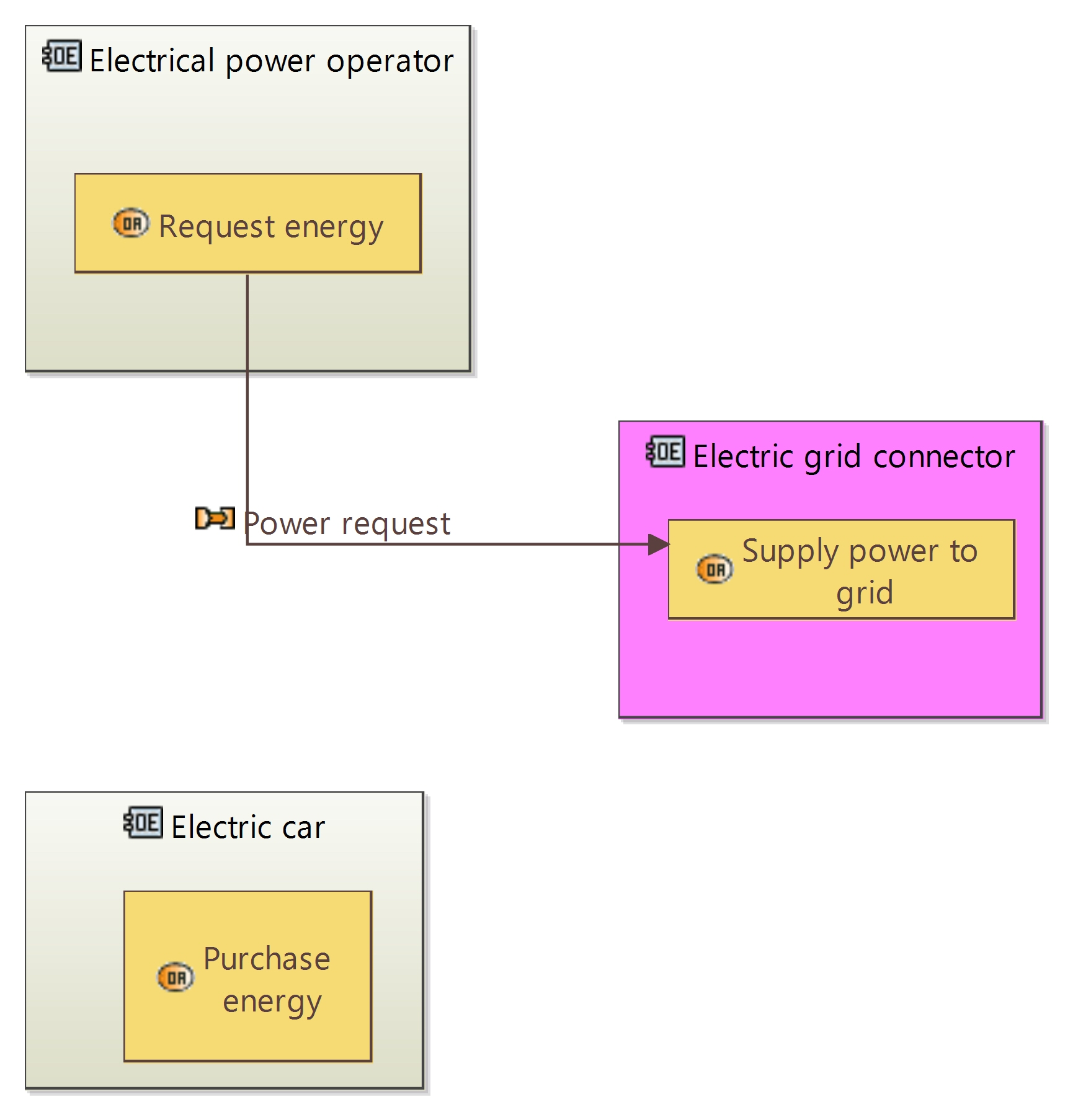 For OA, I would start by asking 'what are the goals of the electrical power operator ?' : not to request energy to a grid connector, but rather to provide energy to customers on demand (mission or capability), ensure regulation of energy according to demand variations, etc (capabilities). For so, the operator will have activities such as product and purchase energy, monitor & control energy production, distribute energy to customers (and possibly feed grid if separate from the operator), etc.