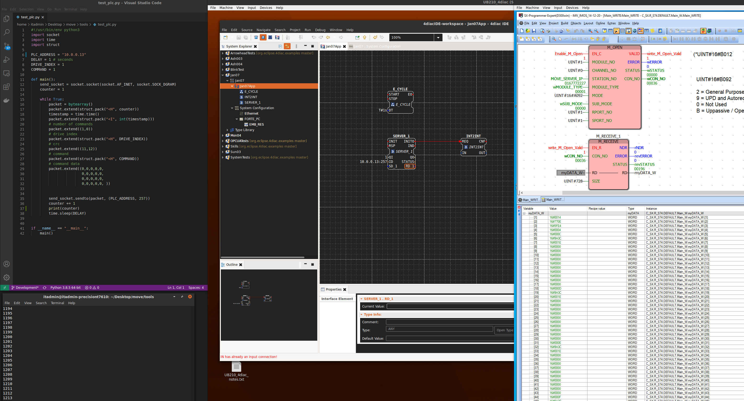 screen shot 2 also shows python program sending out a TCP/IP message and a example of a Fuji PLC recving a TCP/IP message in a word array,