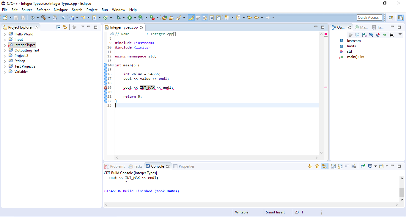 Home » Language IDEs » C / C++ IDE (CDT) » C++ Neon Compiler Error: INT_MAX was not declared in this scope/could not be resolved.(I'm running a simple tutorial program and encountered the error in the thread title.)