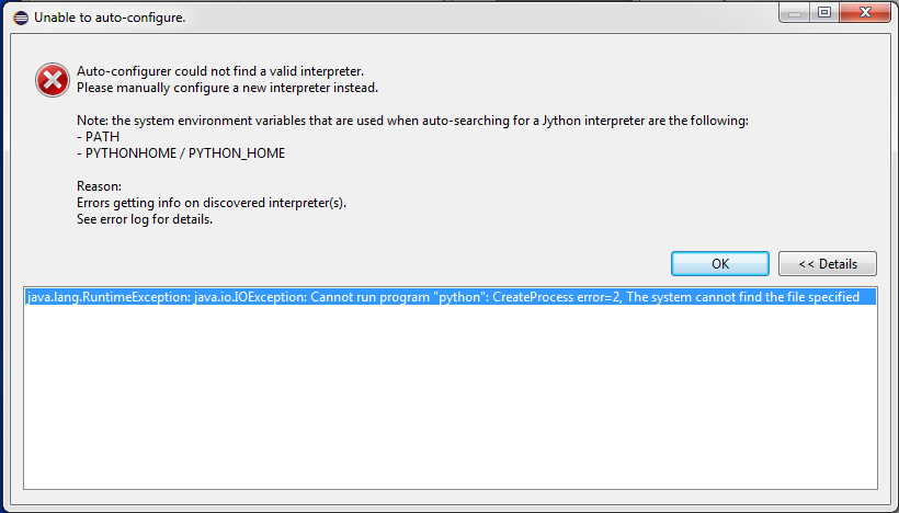 Eclipse is up and running and the PyDev installation appeared to go well, however when efforts were made to configure the Python interpreter, no interpreters were available for selection under the Preference's menu tree. When the Quick Auto-Configure is selected an error is reported in a separate window. (See attachment)
