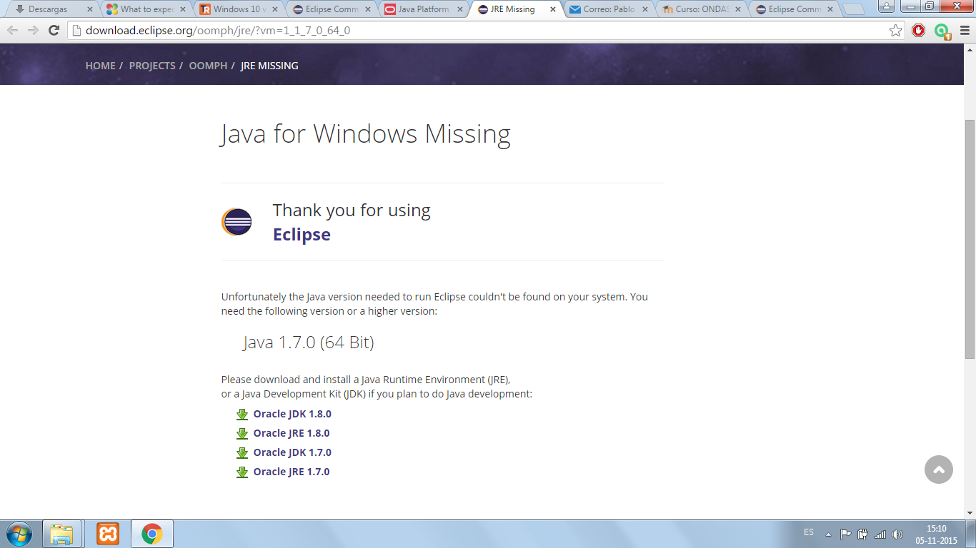 > Installed java first and then tried to install eclipse, but it opens the browser giving me the messaje "java for windows missing", as you can see in the picture.
