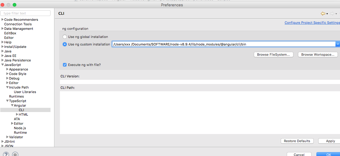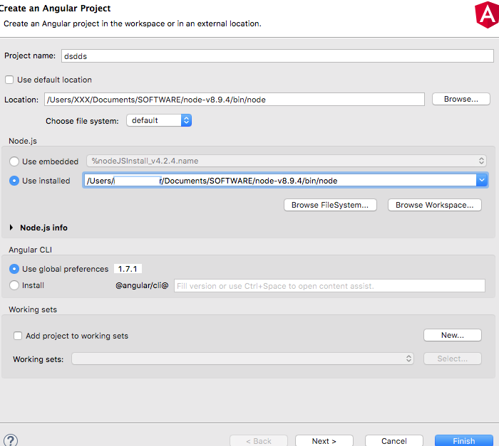 I am facing few issues while creating angular project an during configuration of angular plugin. The "ng new" command works fine on mac terminal but eclipse angular plugin create project but empty with below errors.