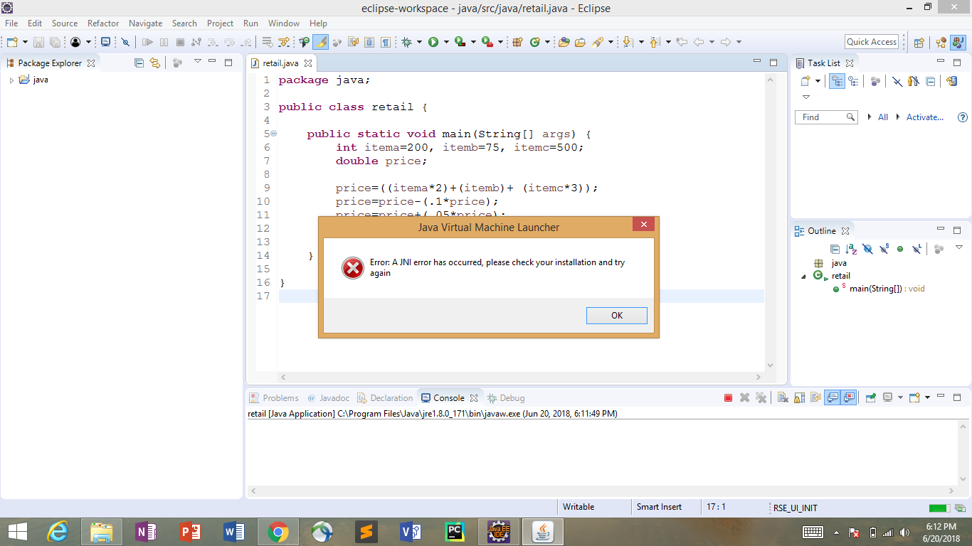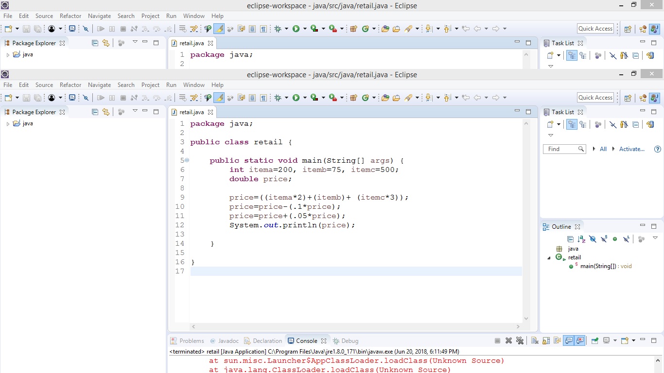It did not give me error message like above, but it showed nothing after I hit run. I would be able to create HelloWorld1.java file and it outputs "Hello world". But it does not run for the above example (retail shop, as a class). Please advise