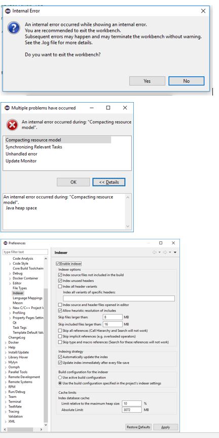 I am running Eclipse 2018-12 on windows 10 machine with 64GB of memory. I have very large C++ project (8993 .cc file and 3241 header files) that is normally built on a Linux machine. I have imported the project to windows machine with Cygwin GCC installed on it. I just want to browse the source files, I am NOT building the project on this windows machine. I end up with this error