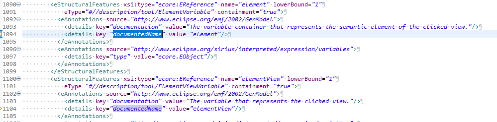I couldn't get any markers, validating the ecore and genmodel reported no error or warnings and couldn't figure out what those referred to, until I did a text search on "documentedName" that was part of some warnings. I found out it came from a referenced model "viewpoints" from Sirius.