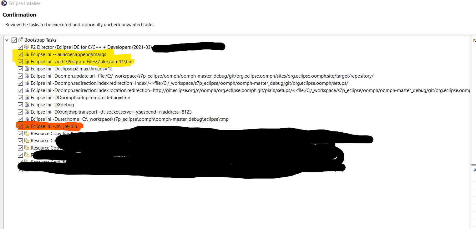 I've now hit a new snag though which I've been going round in circles trying to pinpoint. BOOTSTRAP successfully extracts a J17 JRE into a folder for a 4.31 install, the eclipse ini -vm option points to that folder, all plugins seem to install during BOOTSTRAP, the BOOTSTRAP tasks successfully complete, Eclipse then successfully starts up using the specified JRE, but when the STARTUP tasks kick in, it says I have a long list of requirements that aren't being met and need installing (yet if I look through the setup.log I can see they were).