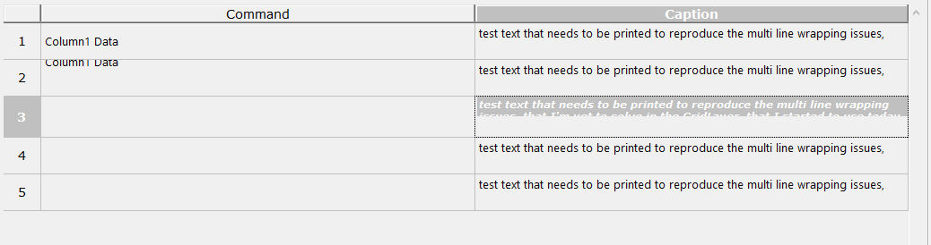 I always return "Column1 Data" for first column Column and "test text that needs to be printed to reproduce the multi line wrapping issues, that I'm yet to solve in the GridLayer, that I started to use today morning :)" for the second column.
