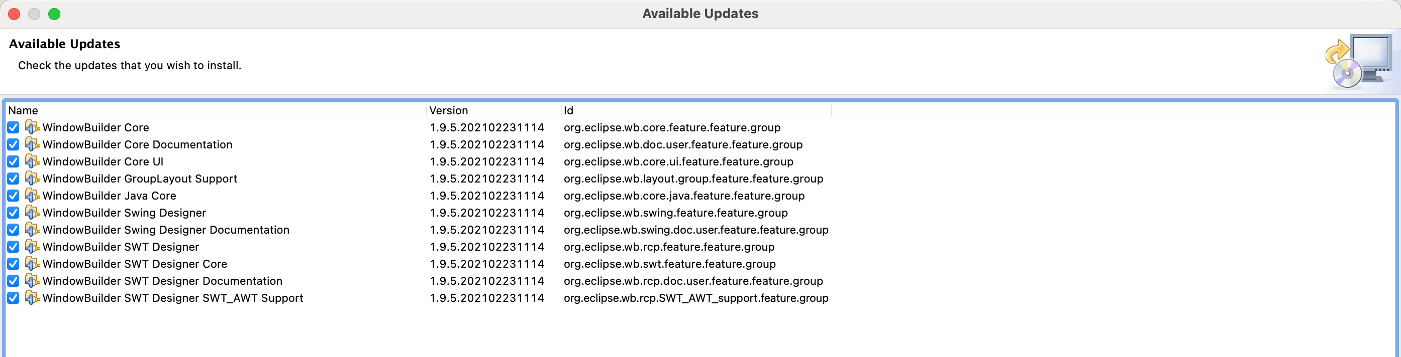 No repository found containing: org.eclipse.update.feature,org.eclipse.wb.core.java.feature,1.9.5.202102231114