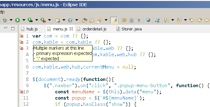 But from what I know, this is valid code and shouldn't be generating errors. It executes well when I deploy it and run it. So I am thinking that it is the javascript version in eclipse that is flagging these. I can't figure out how to change the javascript version. When I pull up the Project->Properties->Project Facets, I see JavaScript is at version 1. When I right click on it, I can unlock it but I can't change the version, even if I unlock it.