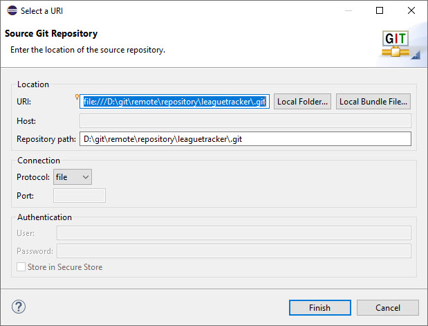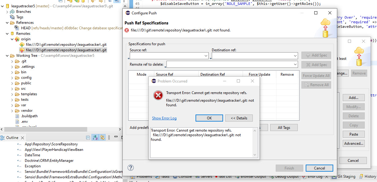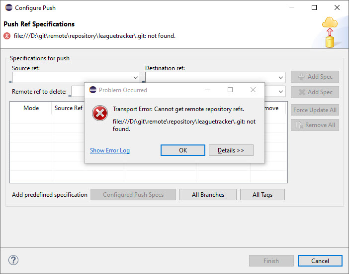 3. I now went back to my original project and could use the various EGit dialogs to create a remote repository, point it at the D:\git\remote\repository\leaguetracker directory, and create all the appropriate Push and Fetch specifications correctly.