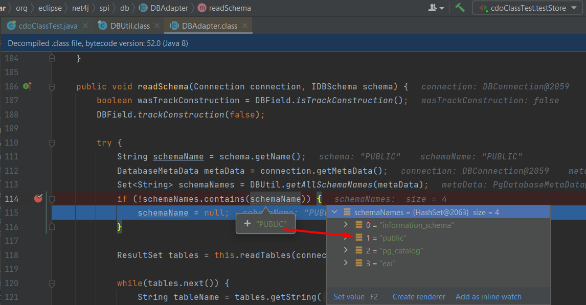 The battery_level_mapping table from the exception located in another schema, not in public but DBAdatper.readSchema() ignores the schema name I passed. Actually, DBAdatper.readSchema() recieves the schema name in UPPER case and then drops schema name to null and tries to read all tables in all schemas. It happens in the last if statement, in the code below Icopied from org.eclipse.net4j.spi.db.DBAdatper class because schemaName is in UPPER case and schemaNames contains schema names in lower case as they are in the database.