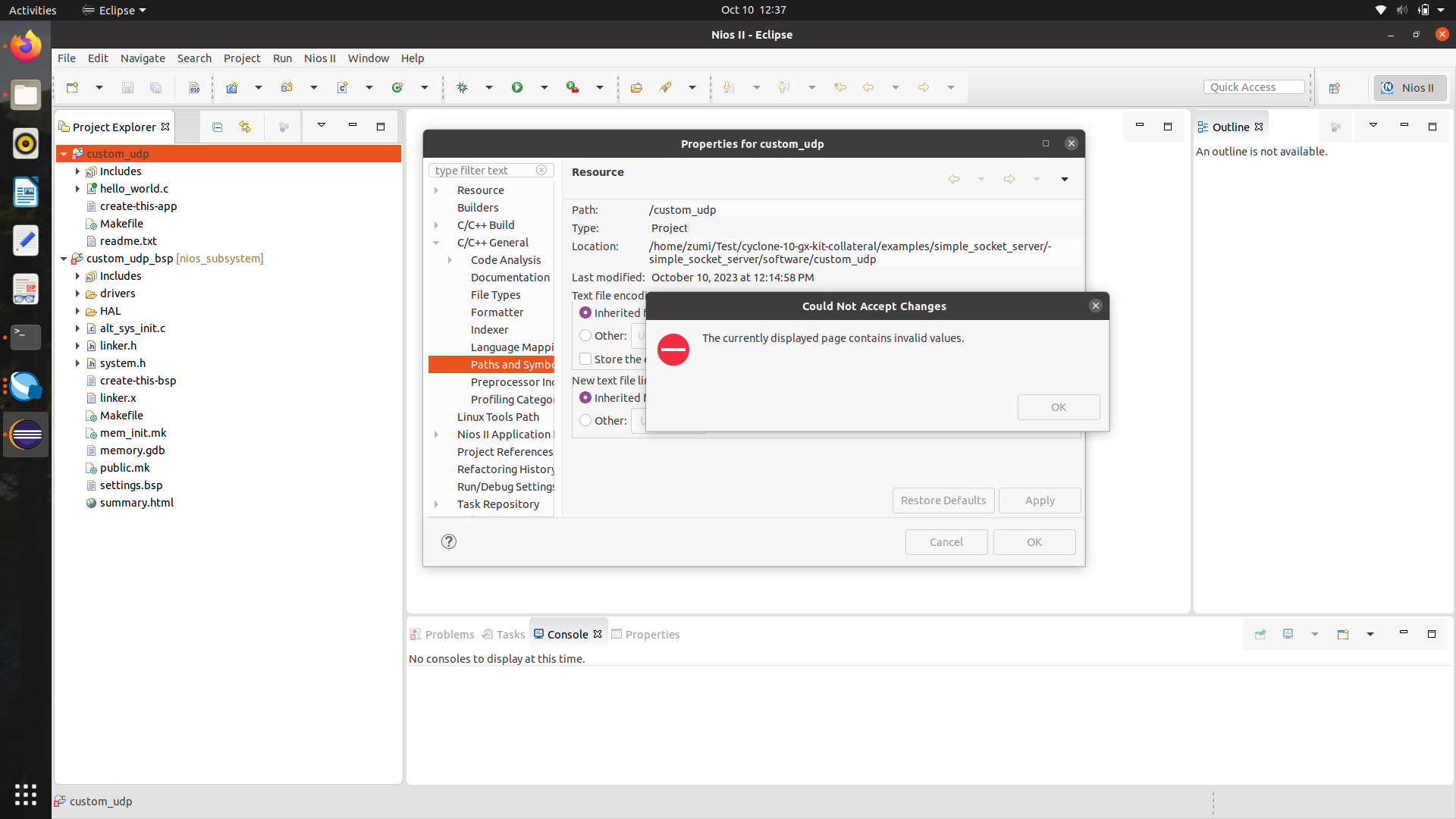 Home » Language IDEs » C / C++ IDE (CDT) » Properties error for Eclipse IDE into Nios 2 EDS(The currently displayed page contains invalid values.)