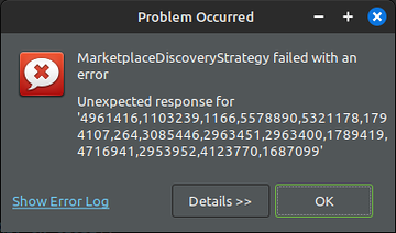 When I click the "Installed" tab in the Marketplace dialog it crashes with the attached "MarketplaceDiscoveryStrategy failed with an error" message: