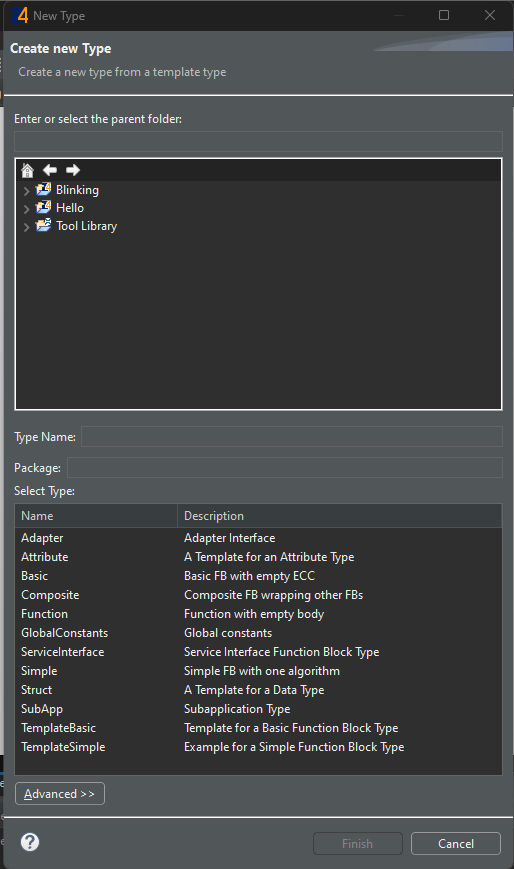 I would like to select an option from a given list in a specific area. The list contains the following options: Blinking, Hello, and Tool Library. Additionally, it is possible to expand these options and select sub-nodes as parent folders.