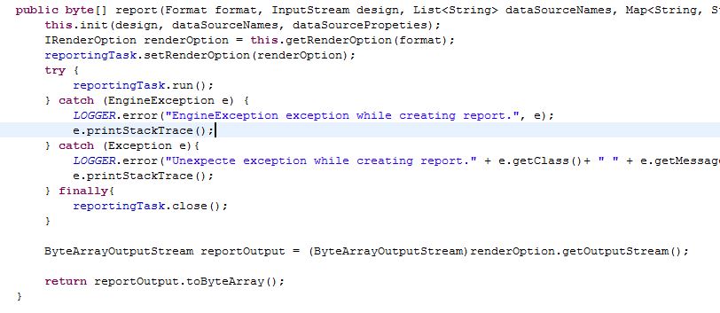 public byte[] report(Format format, InputStream design, List<String> dataSourceNames, Map<String, String>dataSourcePropeties) {