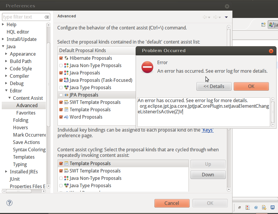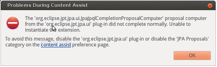 !MESSAGE The 'org.eclipse.jpt.jpa.ui.JpaJpqlCompletionProposalComputer' proposal computer from the 'org.eclipse.jpt.jpa.ui' plug-in did not complete normally. Unable to instantiate the extension.