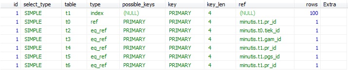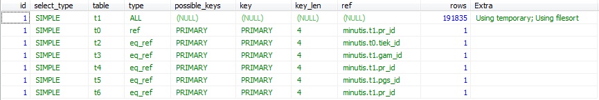 SELECT ... FROM preke t1 LEFT OUTER JOIN preke_tiekejas t0 ON (t0.pr_id = t1.pr_id) LEFT OUTER JOIN tiekejas t2 ON (t2.tiek_id = t0.tiek_id) LEFT OUTER JOIN gamintojas t3 ON (t3.gam_id = t1.gam_id) LEFT OUTER JOIN google_compare t4 ON (t4.pr_id = t1.pr_id) LEFT OUTER JOIN grupe t5 ON (t5.pgs_id = t1.pgs_id) LEFT OUTER JOIN preke_kaina t6 ON (t6.pr_id = t1.pr_id) ORDER BY t1.pr_id LIMIT ?, ?