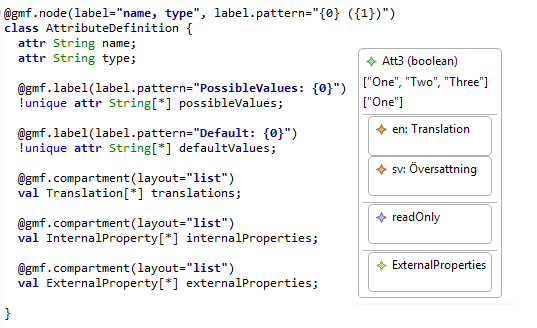 but then I end up with a "!unique attr String[*] possibleValues;" that I seem unable to turn into a @gmf.compartment and I am unable to make it a node in the GMF diagram. (So I can only edit the values from the property window and not able to add them directly in the diagram)