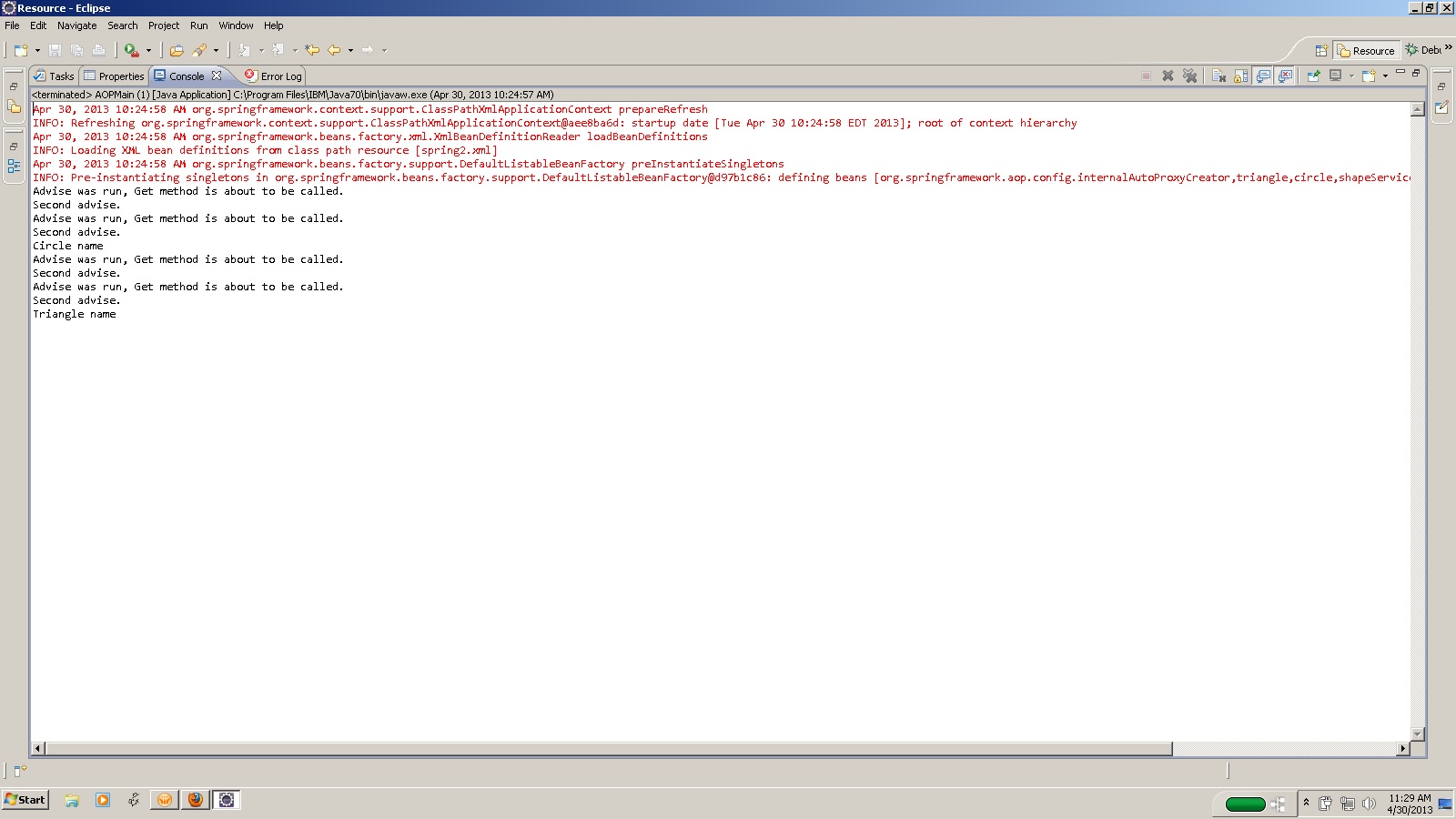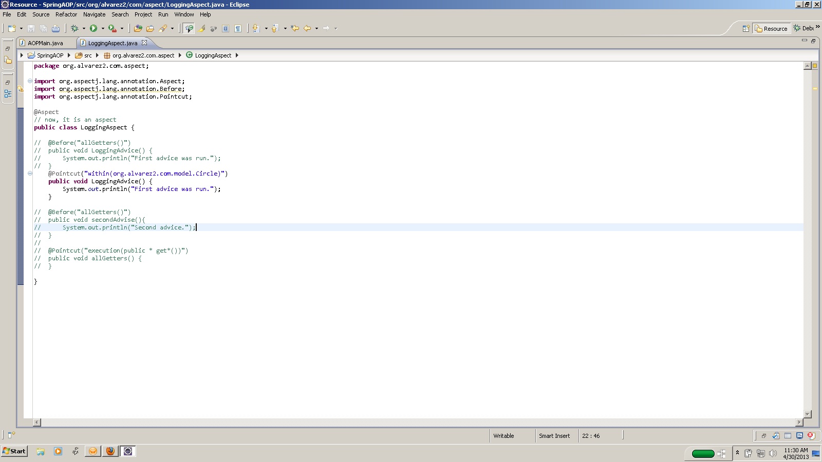 > Sorry I didn't do so earlier, please excuse my newbie mistake: Here is what Eclipse is currently telling me , the result my fooling with the earlier tutorial, and here is what I typed into the LoggingAspect class: , which as you can see should result in Eclipse's printing to the console "First advice was run.", although it should do so a number of times. Now, as many times as I've tried to compile it manually (or checked and unchecked the Project>Build Automatically button) nothing seems to change, still the same old printout. What am I doing wrong?