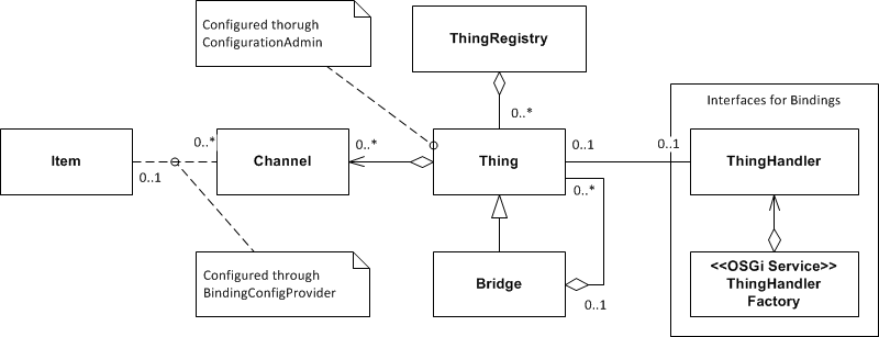 Instead, bindings work with Things by implementing ThingHandlers. A ThingHandler automatically receives command and update events, which are sent to Items bound to the channel of the Thing. Moreover the ThingHandler has access to the Thing and its Configuration. To simplify working with OSGi configuration admin, Dictionaries are automatically transformed into Java objects, which classes can be defined by the binding. Here is a class diagram, which shows the relation between these new concepts: