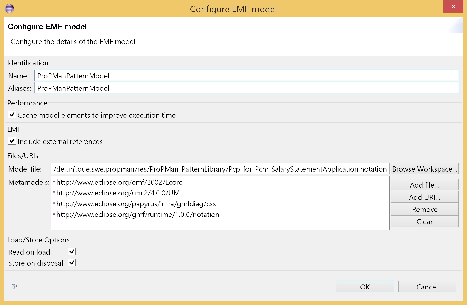 If I use an InMemoryEmfModel instance created according to the preceeding code for the Papyrus notation file, the EOL script returns errors that are related to the meta model (e.g. "Diagram" is not a valid variable, type or model").