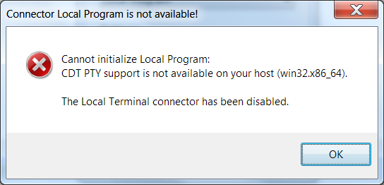 I select opened a "Terminal View" and there selected "New Terminal Connection in Current View", then in the Dialog, I select "Local Program" from the DropDown Box and I get this error:
