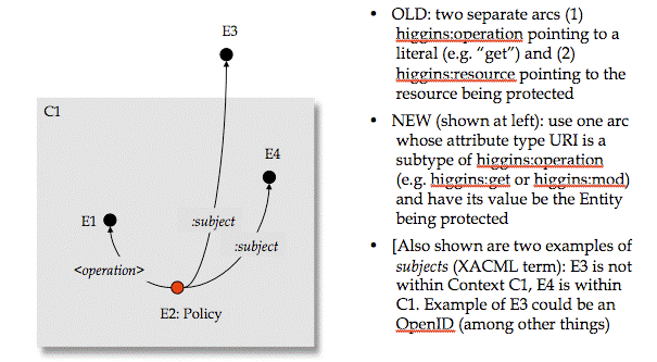 After conversations with Drummond, it appears that there is a simpler way to model the access control semantics of a PolicyEntity. The new proposal is shown below and attached as a TIFF. Only one of the higgins:subject arcs shown below would be needed in the simplest case, but I drew both to show both possible kinds of subjects. As I hope is self-evident, the example below states that subject E3 and subject E4 are permitted <some kind of operation> (e.g. higgins:get, higgins:mod, higgins:del) on Entity E1 (that is, any or all Attributes of E1).