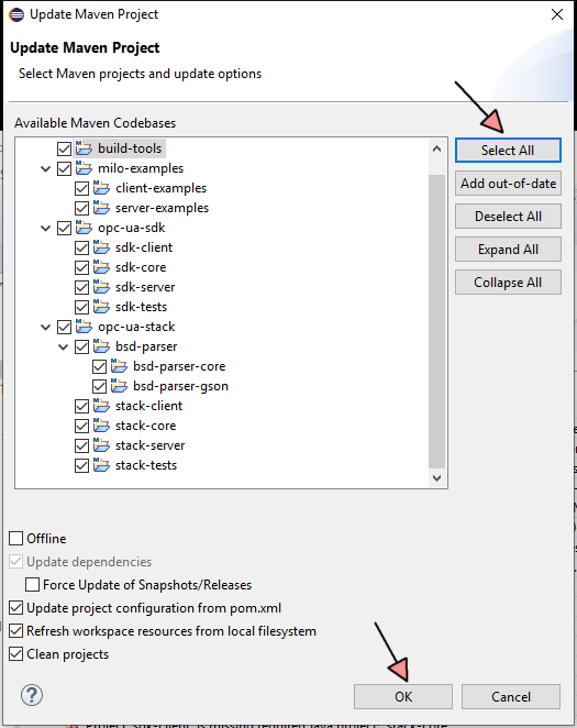 Error “calculating classpath for project MavenProject” can appear. Go on File-System and delete content of “C:\Users\%Username%\.m2\repository\org\eclipse\milo”. See Error Message (Path after “project MavenProject:”)