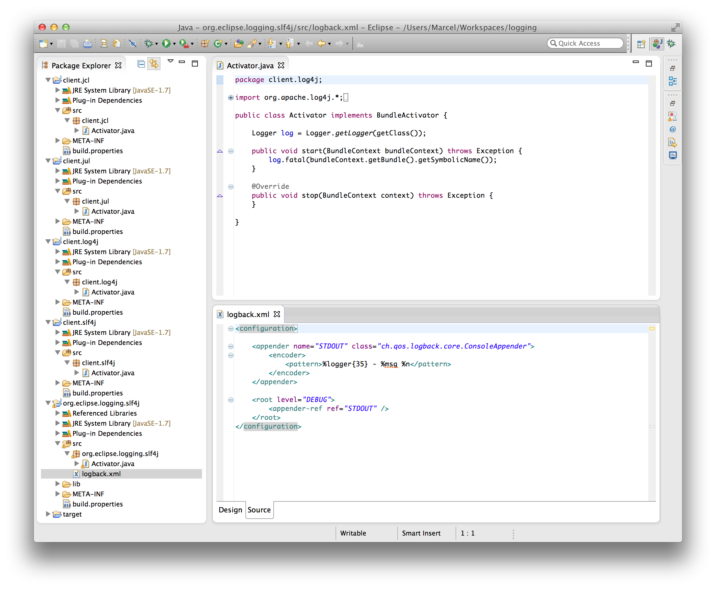 I have read about the OSGi framework and have implemented some simple OSGi apps. Firstly, I implemented a simple bundle and service app by following Lars's tutorial. Then, I implemented separate bundles with activator for all the logging frameworks (log4j, jcl, jul and slf4j) as per the project structure in the snapshot given by you. I executed them both through OSGi in eclipse and through the OSGi console in shell.
