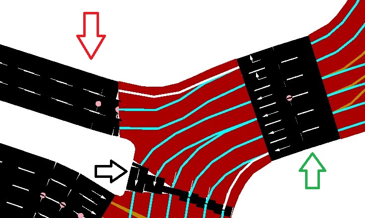 connections proportionally: dividing the number of exit lanes (black and red arrow) by the number of internal circulating lanes (green arrow), so that each internal lane connects to a proportional subset of exit lanes.