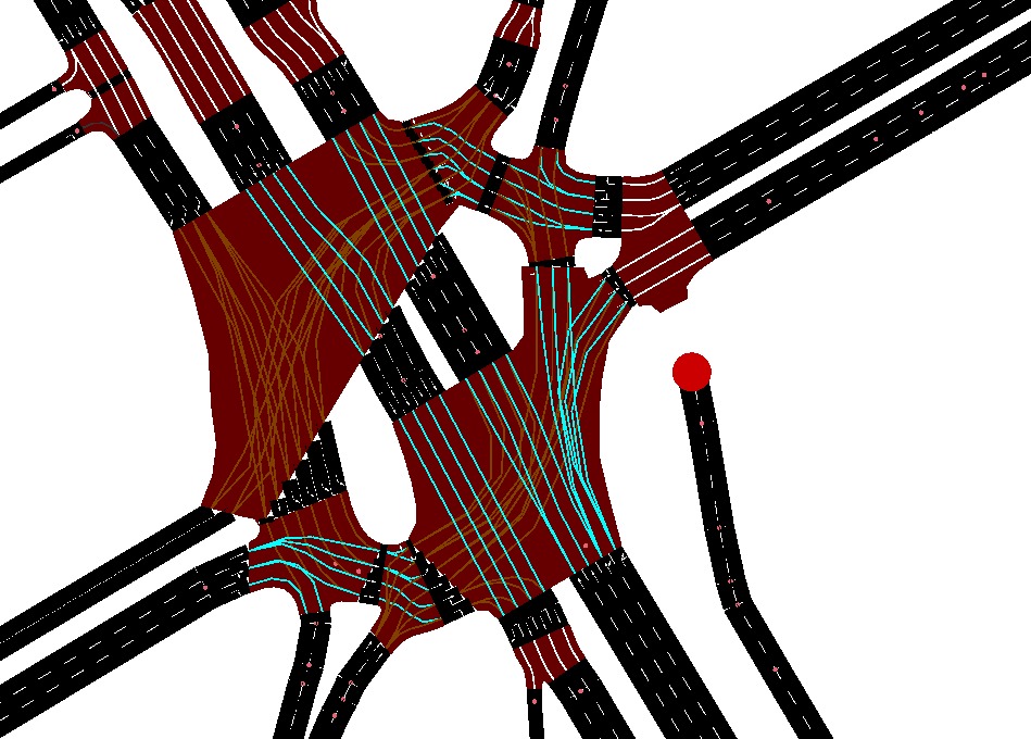 As seen in the images, the intersection is a large roundabout with islands and multiple entry/exit points, the TLS are defined in the same position as reality and are 'actuated'. The current SUMO model has each junction imported as a separate TLS (img. 2).
