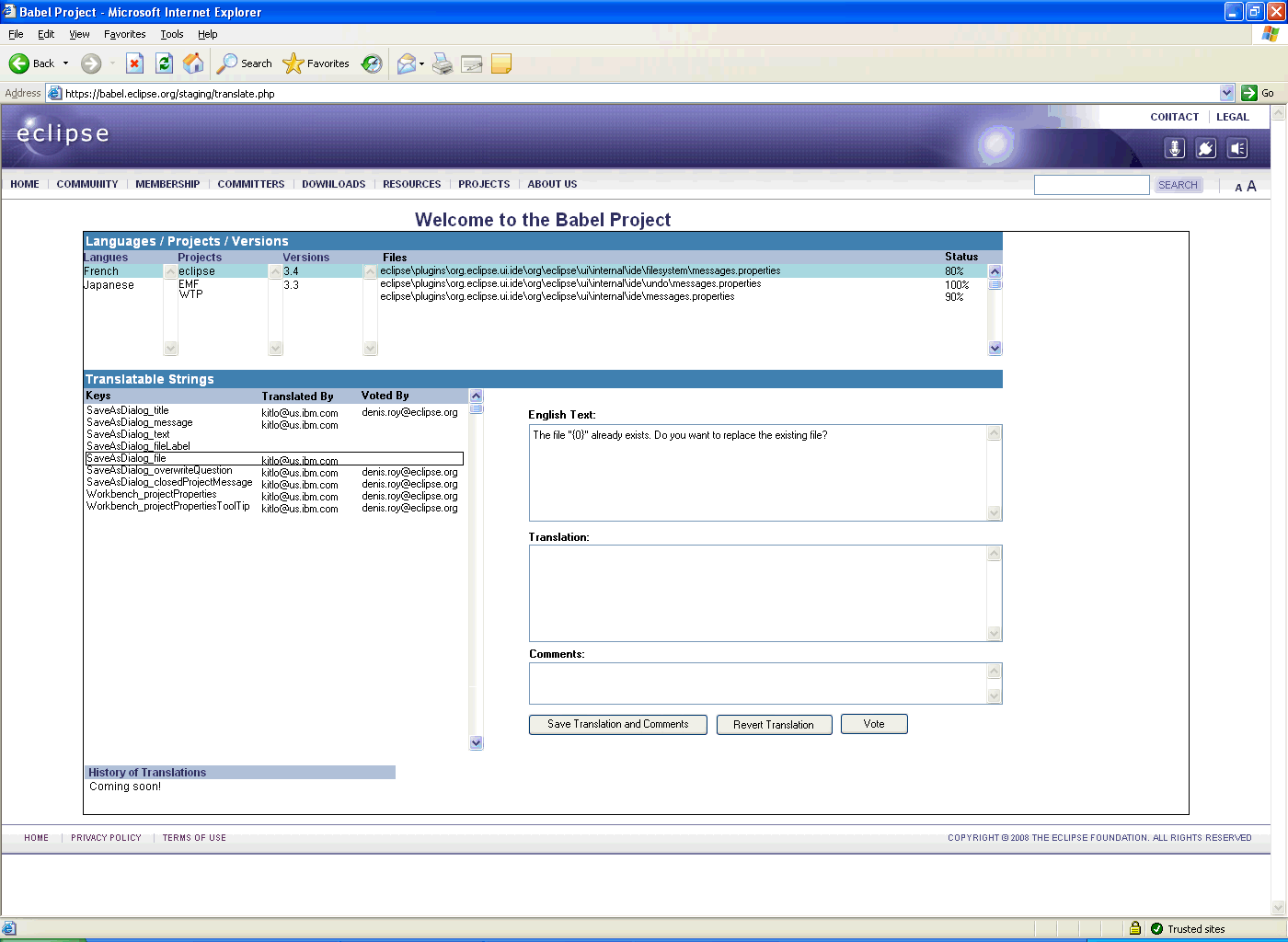 - if someone does not like the current translation, and if he has a newer translation, he may enter the new translation, enter a comment, and save the translation. The "Voted By" column will be cleared. The translation needs to be voted again.