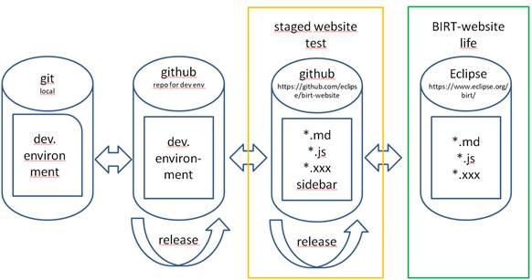 The web-server which hosts the website contains the static web pages as wells as the corresponding md.files which are either located in git/github or in a distinct directory on the website. Clicking on the “Edit this page” link on a web page calls a md editor. If php is activate on the website you can edit the md.file and submit it either to git/gihub or back to is directory from where it was loaded. If there is no php available the md.file can be locally downloaded, edited and from there pushed to git/github again. Github has two roles it’s a repo and a webserver.