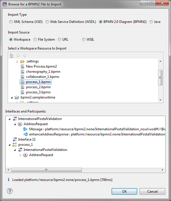 From the "Definitions" property tab of the canvas Property sheet, click "+" on the "Import List" table and select the process file from the "Import Dialog" as shown here: