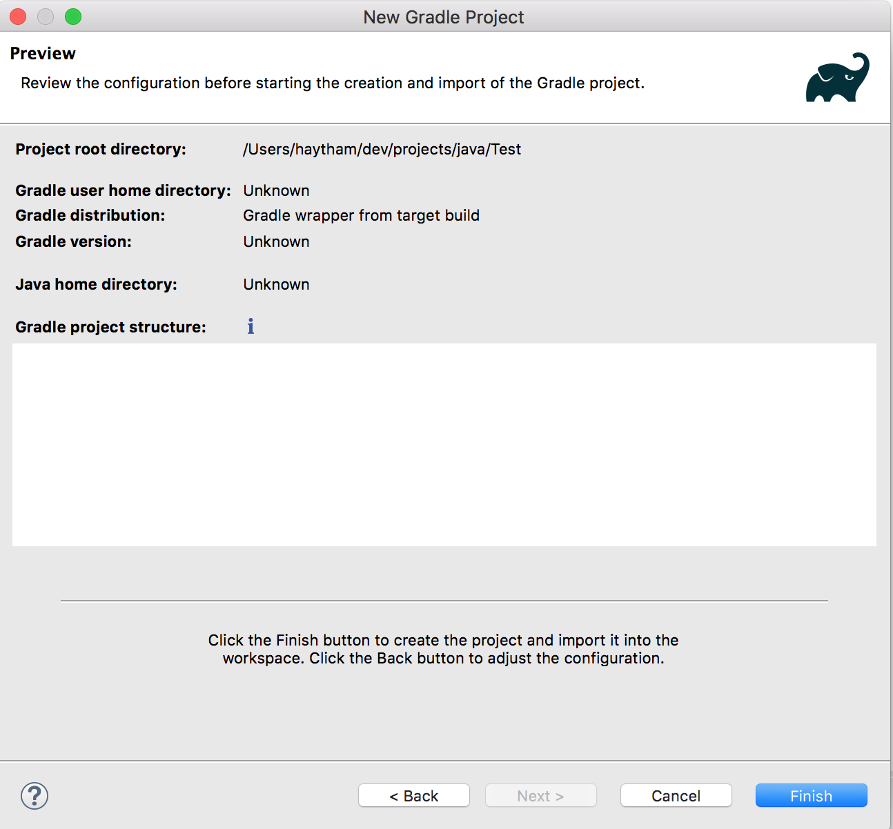 As shown below, when I click Finish, nothing happens. The strange thing is that the cradle user home directory, gradle version, and java home directory are all Unknown!! I cannot understand why! Am I missing smth?